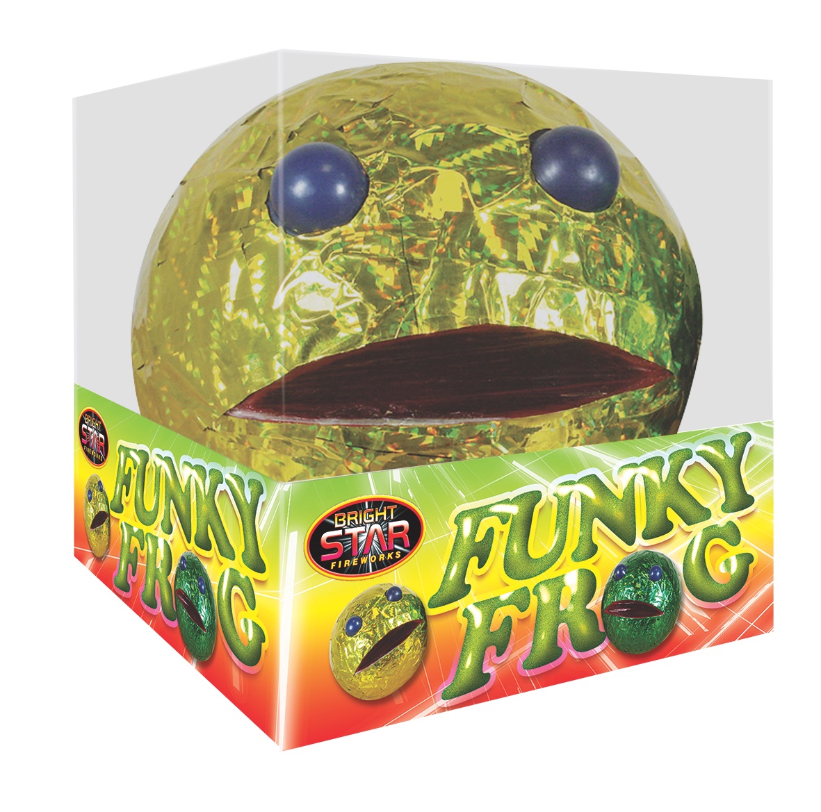 The Funky Frog Fountain is a fun firework with effects that include the eyes and mouth flashing and the top of the head produces a fountain with red plume and blue stars and crackling, changing to silver fountain with blue stars and silver crackling, changing to silver flower with crackling flower.