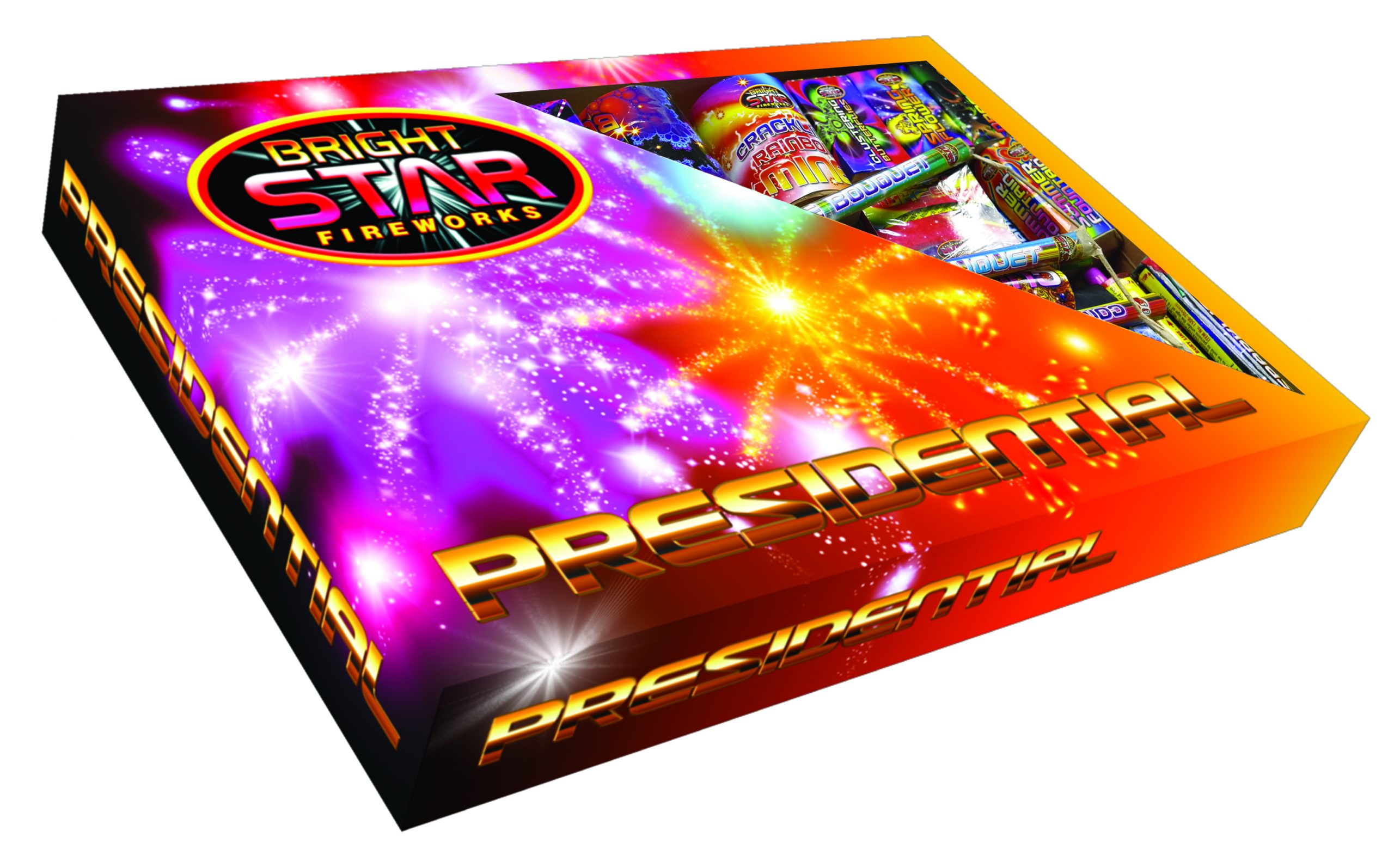 The Presidential Selection Box contains 35 different pieces including 19 shot barrages, wheels, roman candles, mines and fountains.